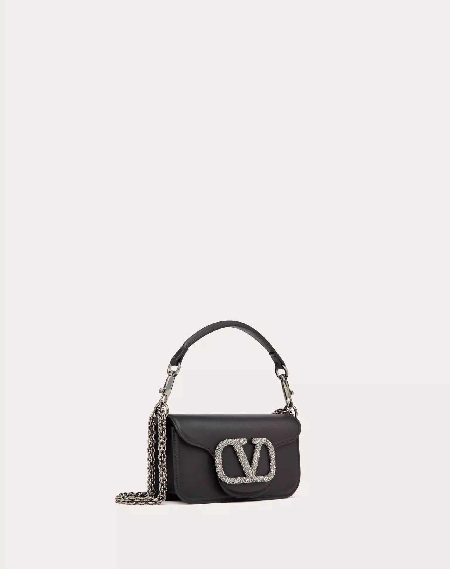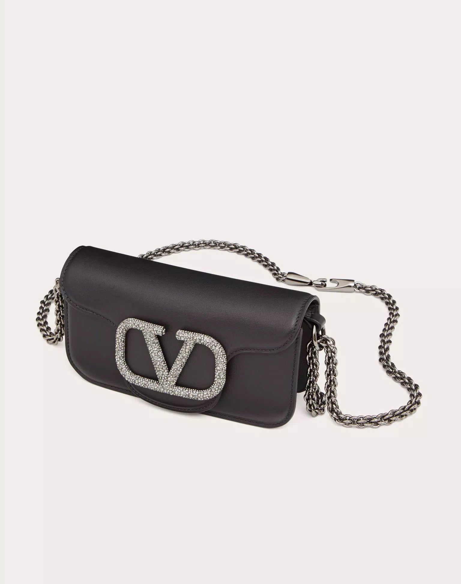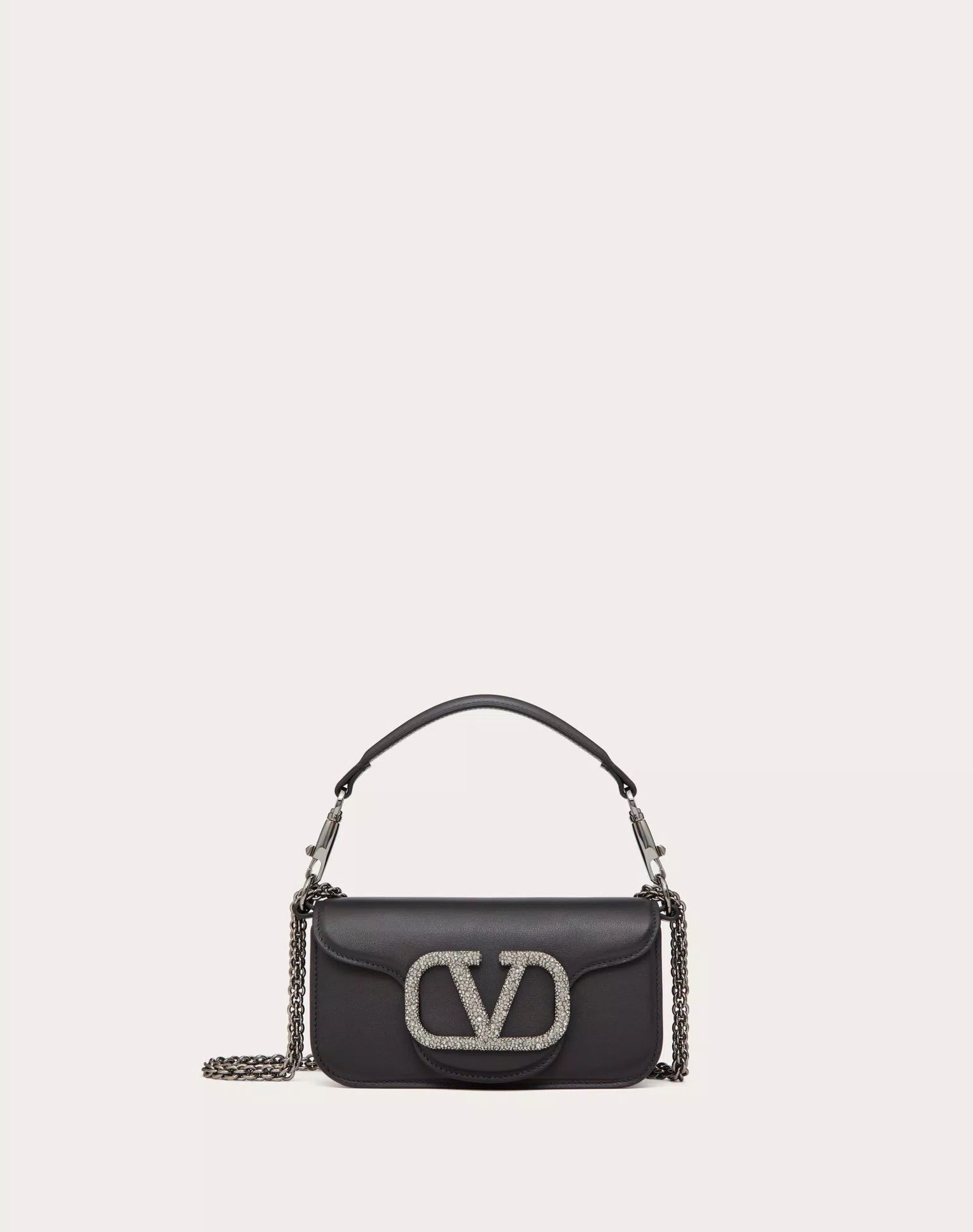Valentino Garavani Locò small shoulder bag in calfskin with VLogo Signature element covered with Swarovski® crystals.